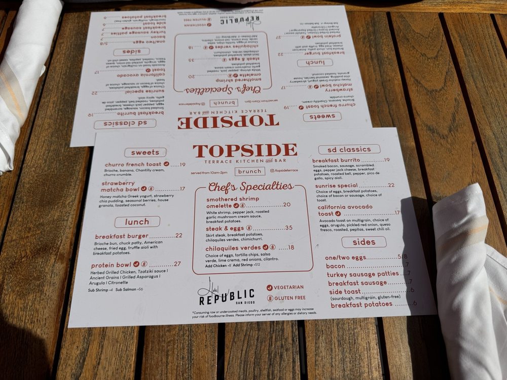 Welcome to Topside Terrace Kitchen & Bar, where culinary creativity meets breathtaking views in the heart of San Diego. This vibrant venue specializes in American fare, particularly renowned for its delightful breakfast and brunch offerings. The menu features standout dishes like the Smothered Shrimp Omelette and the unique Breakfast Burrito, each crafted with fresh ingredients and bold flavors.